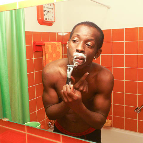 scheert wekelijks, afwisselend droog of nat, 's ochtends in 10 minuten;