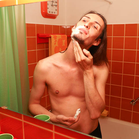 gebruikt scheerschuim, Gillette MACH3 en aftershavebalsem.
