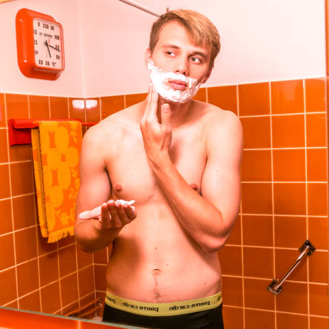Voor deze shoot scheert hij met scheerschuim en Philips OneBlade.