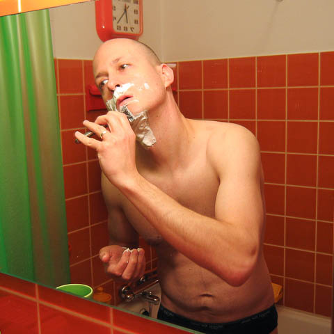 Robert scheert nat, 2 à 3 keer per week ('s avonds), 20 minuten;
