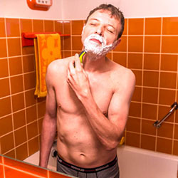 scheert nat, twee keer per week ('s avonds) in 10 minuten.